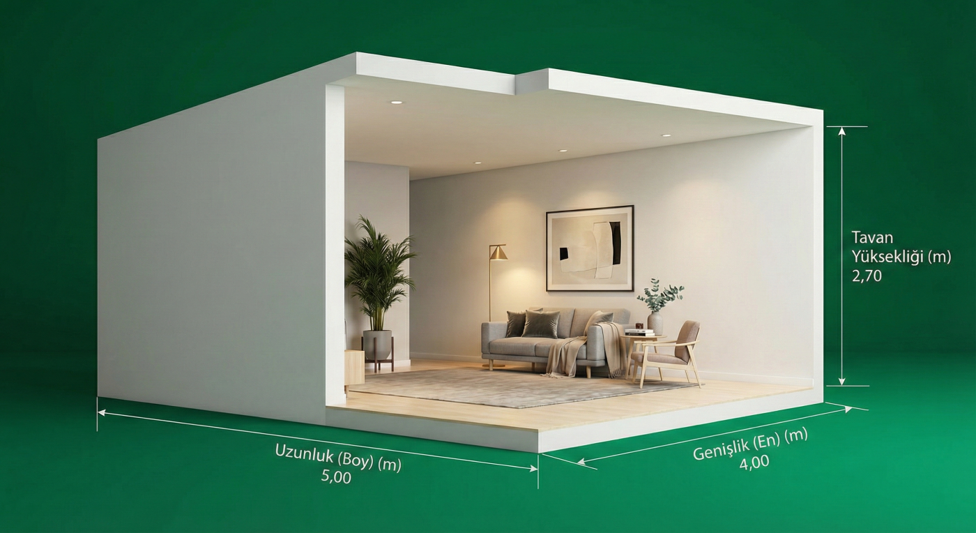 Eğer tavan yüksekliğiniz değişken ise, en güvenli yöntem odanın ortalama yüksekliğini girmektir (En alçak nokta + En yüksek nokta / 2). Veya daha hassas sonuç için her duvarı ayrı birer “oda” gibi düşünüp genişliklerini girerek parça parça hesaplama yapabilirsiniz.
