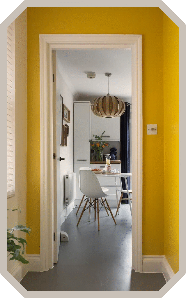 Boyalı gri zeminler, yukarıda gördüğünüz dairenin sarı renkli koridorunda olduğu gibi, dar bir alanda parlak renkli duvarları biraz olsun bastırmak için harika bir seçim olmuş .